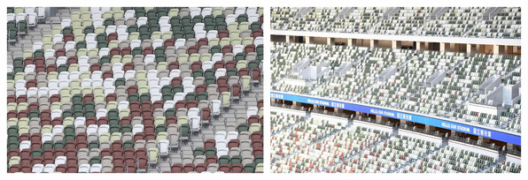 // 没有人时,看起来不会那么寂寞。隈研吾為新國立競技場設計座席時,使用白、米、茶、深綠、淺綠五色,靠賽場的下層多些茶色、靠天空處多些白米、中層則交錯深淺綠。2019年完工時,他一定沒想到這超前部署的五色設計,會讓延期一年開幕的無觀客奧運會場,真如他說的「沒有人時,看起來才不會那麼寂寞。」