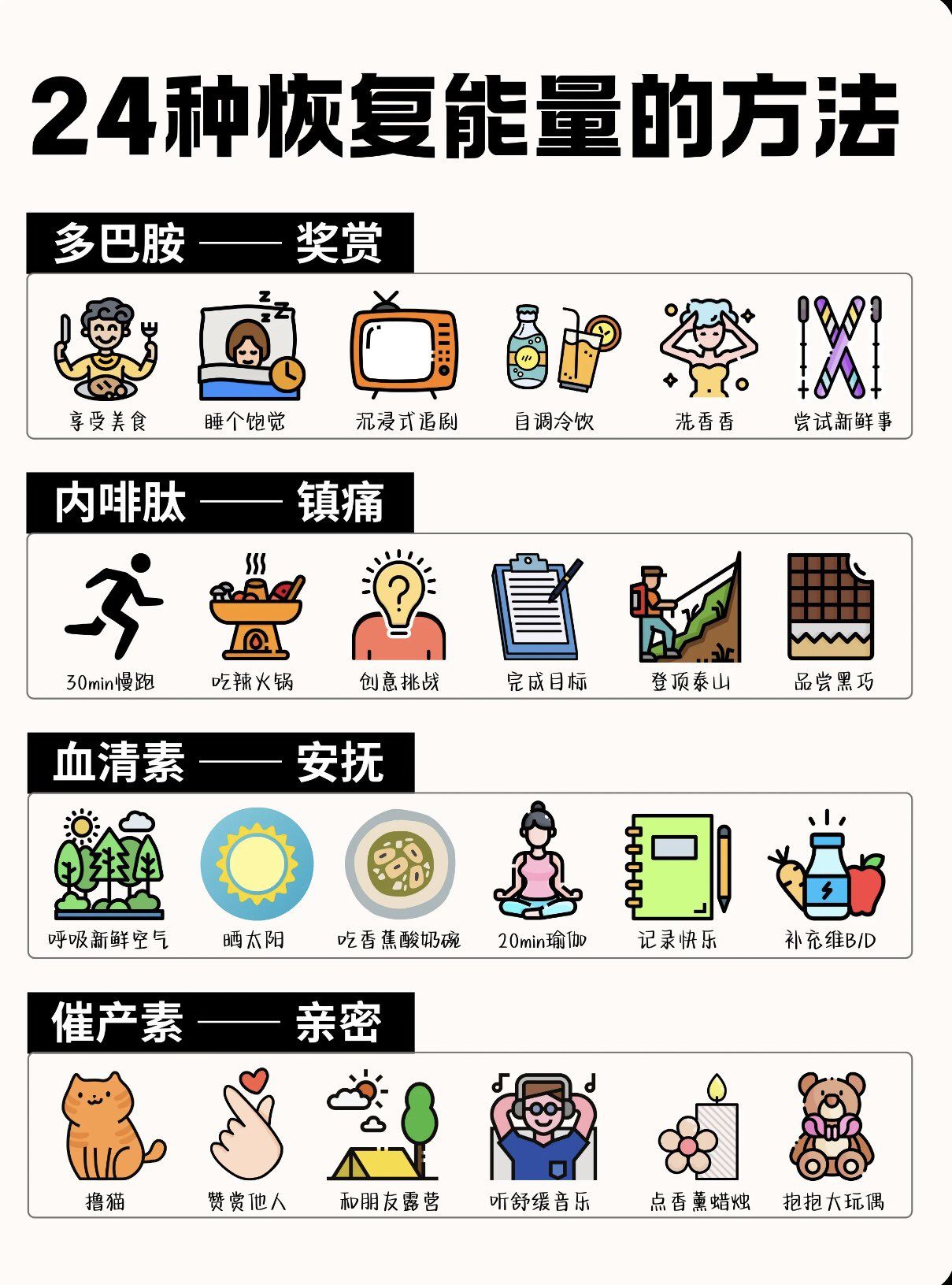 // 二十四种恢复能量的方法。多巴胺奖赏、内啡肽镇痛、血清素安抚、催产素亲密。